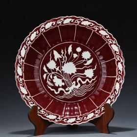 明宣德宝石红釉刻白凤纹菱口折沿盘