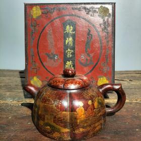 珍藏大清乾隆御制乾清宫藏老漆器盒紫砂壶一套 描金漆器彩绘【柳下聚贤】老紫砂壶一把 紫砂壶高110厘米长18厘米宽13厘米重550克 盒子尺寸:长20厘米宽20厘米高16厘米总重1750克