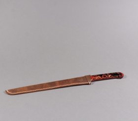 回流 竹雕漆器裁纸刀。 规格:长30.5cm 宽2.5cm 重36.9g 此藏品以竹为材,皮壳醇厚,工艺精良,文雅风趣,包浆醇厚红润,收藏佳品。