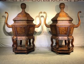精品极品重磅大叶黄花梨大宝鼎熏香炉,全榫卯结构。打磨光滑。满鬼脸,牛毛纹清晰,难遇的花纹。包浆醇厚细腻温润。细节到位长172厘米,高260厘米。厚61厘米76000。 7g16