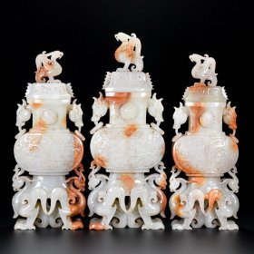 精品和田白玉 旧藏回流 龙凤三宝玉瓶 一套 玉质刚性细腻油润 包浆醇厚 沁色自然 雕工精湛流畅 品相完美 细节如图 尺寸小26×9.5×5厘米 尺寸大28×10.7×5厘米 总重3408.5克
