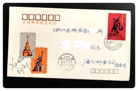 “J”字头纪念邮票实寄封:厦门市邮票公司《苏联邮票展览》纪念封,贴J.142邮票,开展日厦门邮票公司颜惠珍先生寄浙江瑞安~信封左下角有展品提供者何大仁教授签名