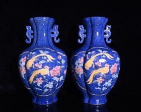 雪花兰五彩开窗花鸟纹双耳瓶,高36.×22厘米