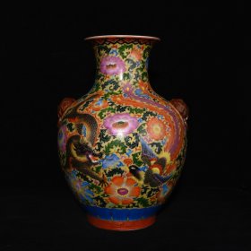 清乾隆年制珐琅彩刻金龙凤花卉纹兽耳尊,高38.5×27厘米