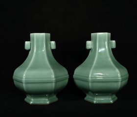 清乾隆年制豆青单色釉贯耳六方贯耳尊一对,高27×23厘米