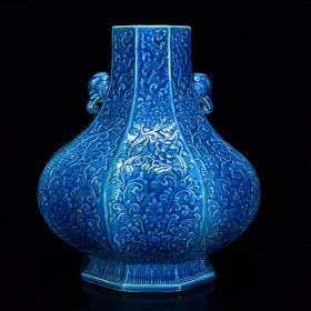 清乾隆年孔雀蓝刻花象耳六方尊27*22