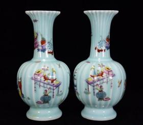 清乾隆年天青釉粉彩博古纹瓜棱花觚27*13