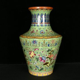 清乾隆果绿地珐琅彩描金灵芝福寿延年花卉纹盘口瓶 高41厘米 直径27厘米
