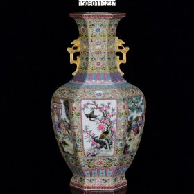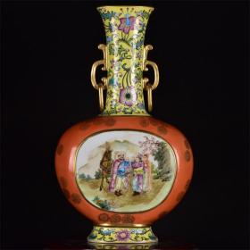 清乾隆年制黄釉珐琅彩粉彩沙红开窗风尘三侠双耳扁肚瓶 规格:47.5x27x14厘米
