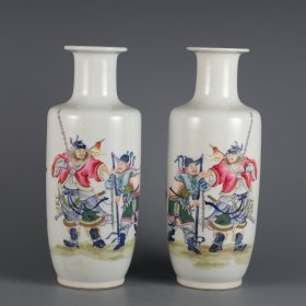 清乾隆年制青花加粉彩人物棒子瓶一对 尺寸:高度27㎝肚径10.5㎝口径7㎝