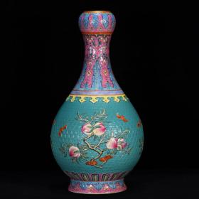 清乾隆年粉彩松石绿釉雕刻桃纹描金蒜头瓶27*14m