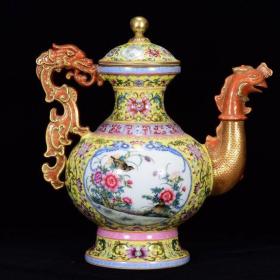 古董古玩瓷器清乾隆年珐琅彩鎏金花鸟纹壶27*26m
