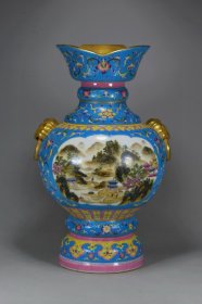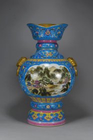清乾隆年制 珐琅彩鎏金扎道扒花西番莲双开窗山水纹兽头元宝瓶 高45厘米 直径27厘米