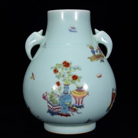 清乾隆年天青釉博古纹象耳尊27*21m