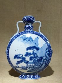清乾隆年制青花山水人物如意耳扁瓶,尺寸34.5/27