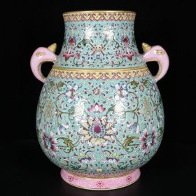 清乾隆绿地珐琅彩描金福寿延年纹象耳尊 规格27厘米X23厘米X21厘米