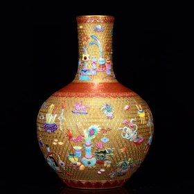清乾隆年珐琅彩鎏金雕刻博古纹天球瓶40*27m