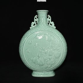 清乾隆年制单色釉雕刻福寿石榴纹双耳扁瓶,高37×27厘米