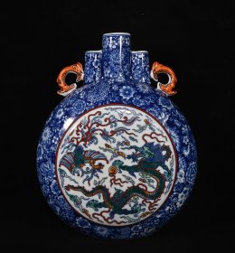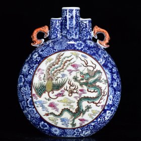 清乾隆年制青花斗彩龙凤纹双耳扁瓶,高27×21厘米