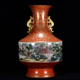 清乾隆年矾红色的彩山水楼阁纹描金瓶耳瓶46*27m