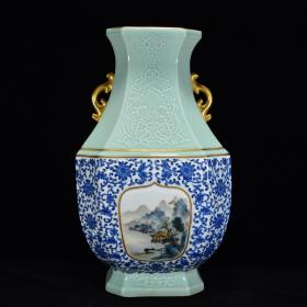 清乾隆年豆青釉青花粉彩山水纹描金四方扁瓶48*27m