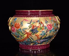 清乾隆年珐琅彩鎏金雕刻百鸟朝凤纹狮耳缸20*27m5600¥