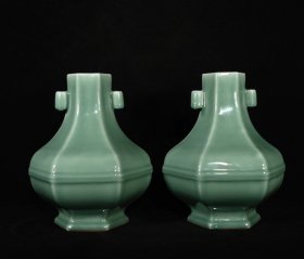 清乾隆年制豆青单色釉贯耳六方贯耳尊一对,高27×23厘米