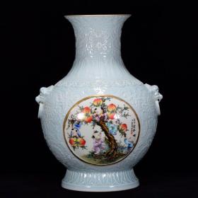 清乾隆年天青釉雕刻粉彩五子献寿纹虎头瓶37*27
