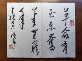 不妄不欺斋藏品:佟韦书法“革命有至乐,奋笔无穷年。中继同志 佟韦”,钤“庚午”朱文印,“佟韦弄墨”白文印。册页尺寸约31cm×19cm×2(同一上款之六)
