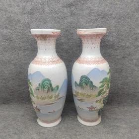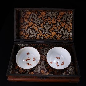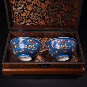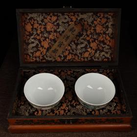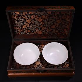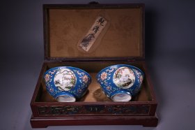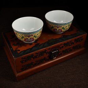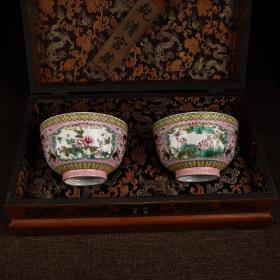 手绘珐琅彩瓷器碗一对 品相保存完好 画工精细 配老漆器盒一个 盒长38厘米 宽22厘米 碗单个重270克 高7.5厘米 直径13厘米