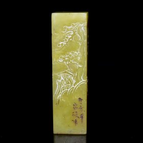 旧藏老货 寿山石艾叶绿印章 原石原色纯手工雕刻 薄意工艺 雕工精细 保存完整 石质通透坚硬 篆刻家【昌硕】丁亥年作600️ 尺寸:3.5*3.5*12厘米 重量:340克