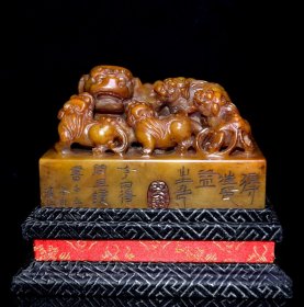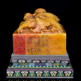 旧藏老货 寿山石田黄石印章 石质通透坚硬 原石原色纯手工雕刻 造型独特 血丝纹清晰可见 包浆老气 篆刻家【三庚】丙寅年作4400️ 尺寸:7.5*7*10厘米(含底座高)净高7厘米 重量:565克