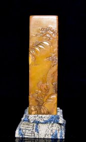 早期收藏 寿山石田黄石印章 原石原色纯手工雕刻 雕工精细 血丝纹清晰可见 篆刻家【石卿】作 收藏摆饰佳品4800️ 尺寸:3.3*3.3*15厘米(含底座高)净高12厘米 重量:345克