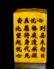 旧藏珍品 寿山石田黄石印章 石质通透坚硬 原石原色纯手工雕刻 萝卜丝纹清晰 包浆醇厚 保存完整 篆刻家【王大炘】戊申年作2400️ 尺寸:2.8*2.8*11厘米(含底座高)净高8厘米 重量:128克