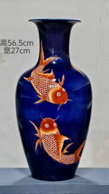 326_“大清康熙年制”宝石蓝釉矾红彩“金玉满堂”纹赏瓶。器形端庄,一道釉宝石蓝打底,矾红彩绘制“金玉满堂”,鱼纹绘制逼真,赋予动感,鳞片叠压,色彩艳丽稳定,尺寸硕大,全品无残,成色如图