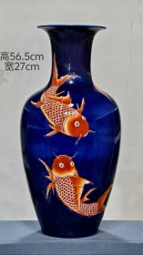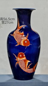 349_“大清康熙年制”宝石蓝釉矾红彩“金玉满堂”纹赏瓶。器形端庄,一道釉宝石蓝打底,矾红彩绘制“金玉满堂”,鱼纹绘制逼真,赋予动感,鳞片叠压,色彩艳丽稳定,尺寸硕大,全品无残,成色如图