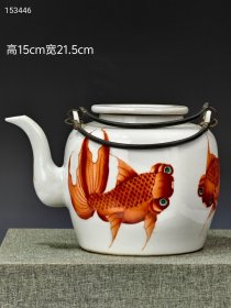 103_【同治年制】矾红彩“金玉满堂”纹提梁壶。器形端庄,造型传统,矾红满绘金鱼纹,色彩堆垛,触摸有明显凹凸质感回馈皮肤,底部四字章款,器形端庄周正,品相完整,成色如图。