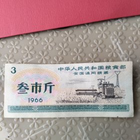 1966年全国通用粮票一张,叁市斤。