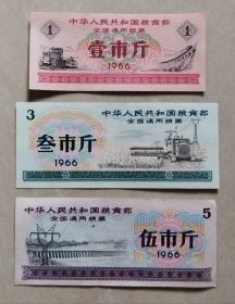 1966年全国通用粮票一组(3枚):壹市斤、叁市斤、伍市斤