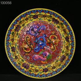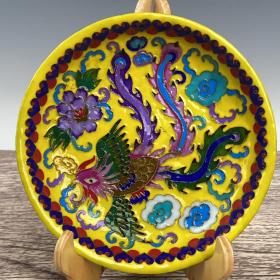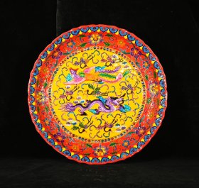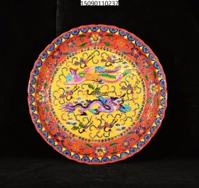 宋汝瓷宣和殿款掐丝珐琅彩黄地缠枝花龙凤纹大盘