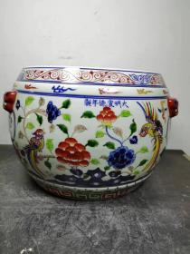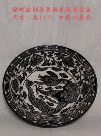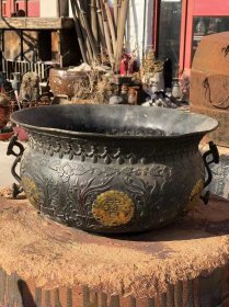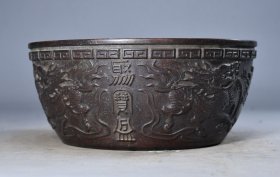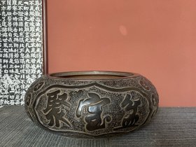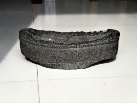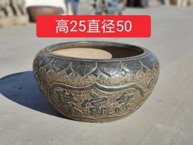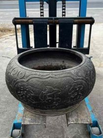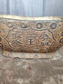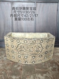 黑青石【聚宝盆】1750 直径 50 高 20 上等青石手工雕刻,雕工细腻精湛,通身满工铜钱图案,两面雕刻聚宝盆!皮壳老气,沧桑古朴!保存十分完整!可种花养鱼,装置茶楼会所!