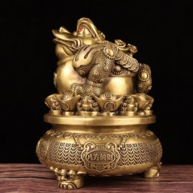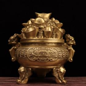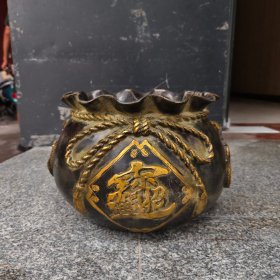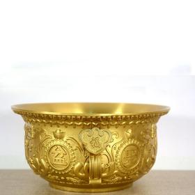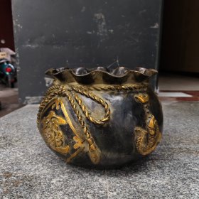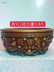 精品收藏锦盒包装紫铜鎏金聚宝盆 保存完好,包浆厚重,雕刻精致 宝贝尺寸:直径17.6厘米,高8厘米 锦盒尺寸:长宽高23/23/11.5厘米