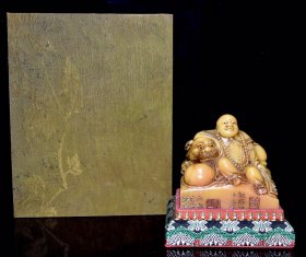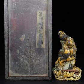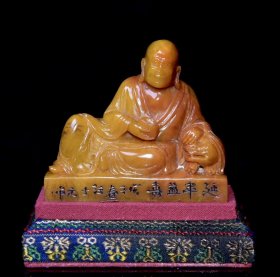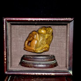 旧藏老货 寿山石田黄石人物摆件 原石原色纯手工雕刻 雕工精细 造型独特 萝卜丝纹清晰可见 形象逼真 乾隆四十五年内務府造辦處造 尺寸:8*6*11厘米(含底座高)净高8厘米 重量:553克