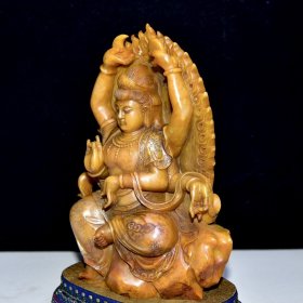 回流老货 寿山石田黄石人物摆件 原石原色雕刻 雕工精细 结晶体结构 包浆老气 磨损自然 尺寸:13*7*17厘米(含底座高)净高14厘米 重量:842克