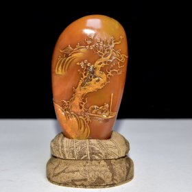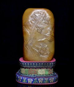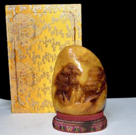 旧藏珍品 寿山石田黄石摆件 石质通透坚硬 原石原色纯手工雕刻 血丝纹 萝卜丝纹清晰可见 乾隆歲次癸巳仲秋御筆 尺寸:7*4*17厘米(含底座高)净高12厘米 重量:713克