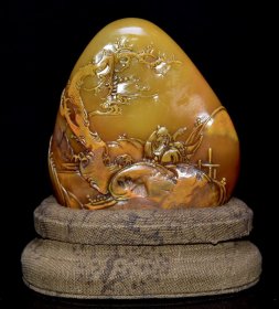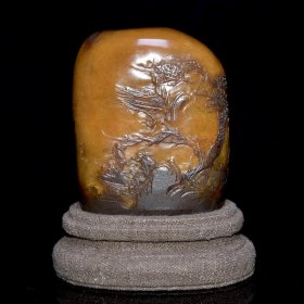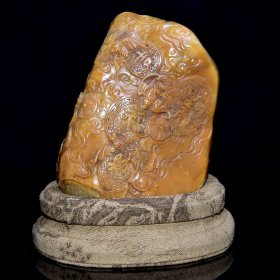 早期收藏 寿山石田黄石摆件 原石原色雕刻 雕工精细 结晶体结构 血丝纹 萝卜丝纹明显可见 篆刻家【友竹】作 尺寸:7*4*12厘米(含底座高)净高8厘米 重量:359克