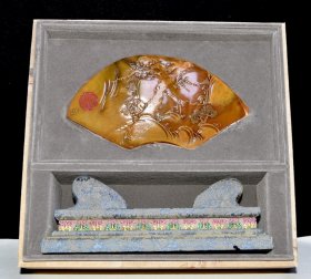 早期收藏 寿山石田黄石扇形摆件 原石原色雕刻 雕工精细 结晶体结构 血丝纹 萝卜丝纹明显可见 篆刻家【友竹】作 尺寸:16*2*15厘米(含底座高)净高8厘米 重量:586克