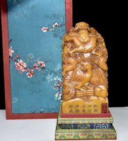 旧藏珍品 寿山石田黄石大摆件 原石原色纯手工雕刻 工艺精湛 石质通透坚硬 萝卜丝纹清晰 包浆老气 皮壳老辣 乾隆四十三年内務府造 尺寸:9*9*23厘米(含底座高)净高18厘米 重量:2896克
