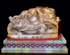 A早期收藏 老寿山石高浮雕《招财》貔貅摆件 原石原色纯手工雕刻 雕工精细 石质油润坚硬 包浆老气 篆刻家【滄門】作 收藏摆饰佳品 尺寸:14*7*16厘米(含底座高)净高12厘米 重量:1891克