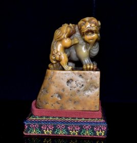 旧藏老货 寿山石田黄石印章摆件 原石原色纯手工雕刻 雕工精细 造型独特 包浆老气 保存完整 篆刻家【奚冈】丙午年作 尺寸:6.5*5*12厘米(含底座高)净高9厘米 重量:433克